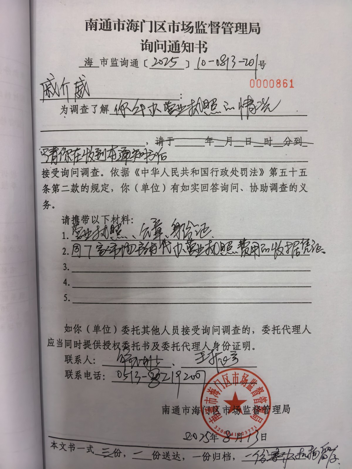 本局于2025年8月13日依法对你作出《南通市海门区市场监督管理局询问通知书》(海市监询通〔2025〕10-0813-201号)。因采取其他送达方式无法送达,依据《市场监督管理行政处罚程序规定》第八十二条第(五)项的规定,本局决定依法向你公告送达《南通市海门区市场监督管理局询问通知书》,内容见附件。