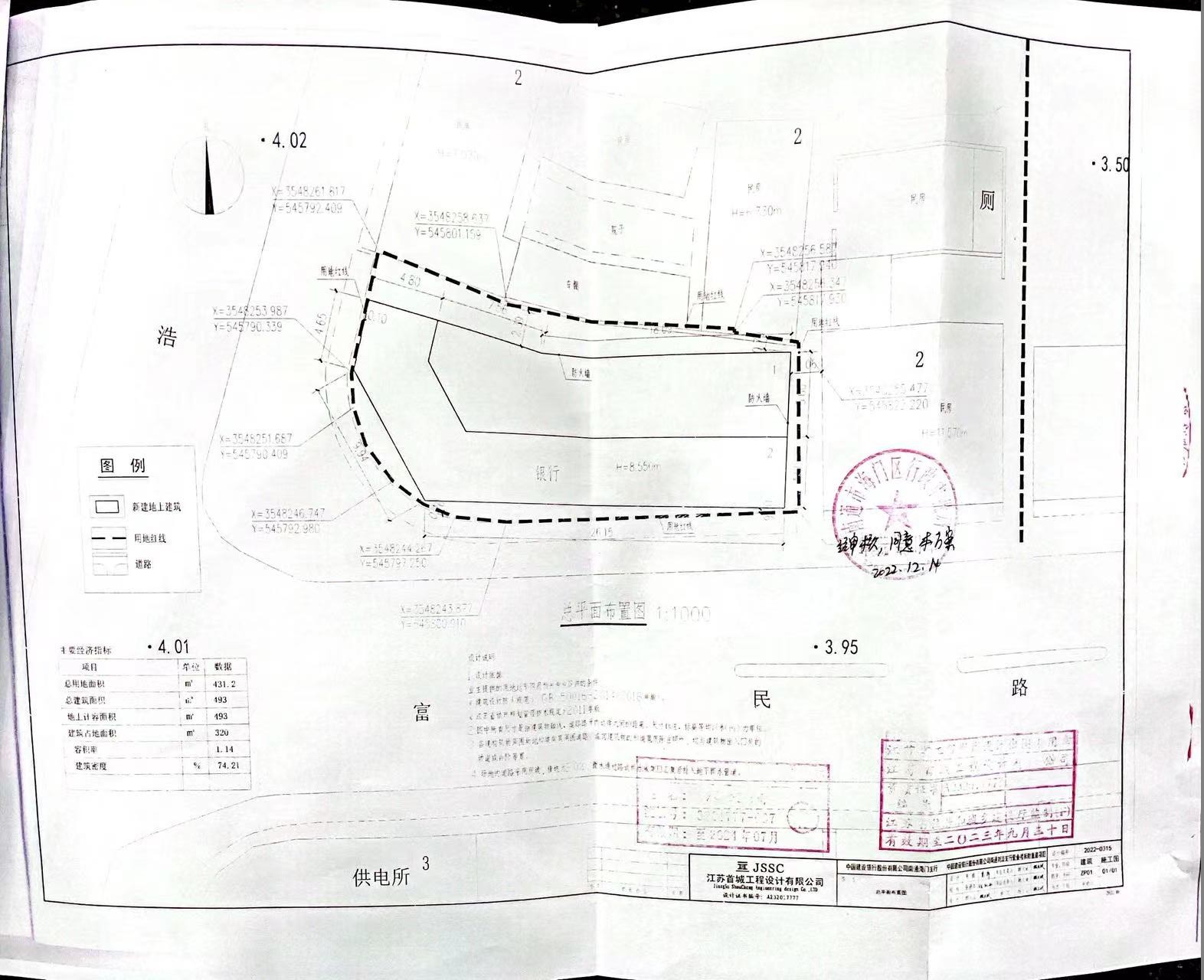 本项目用地位于南通市海门区刘浩镇富民路1号,本次新建建筑面积493M2,应建人防面积27.91M2,其余相关技术经济指标详见总平面图。